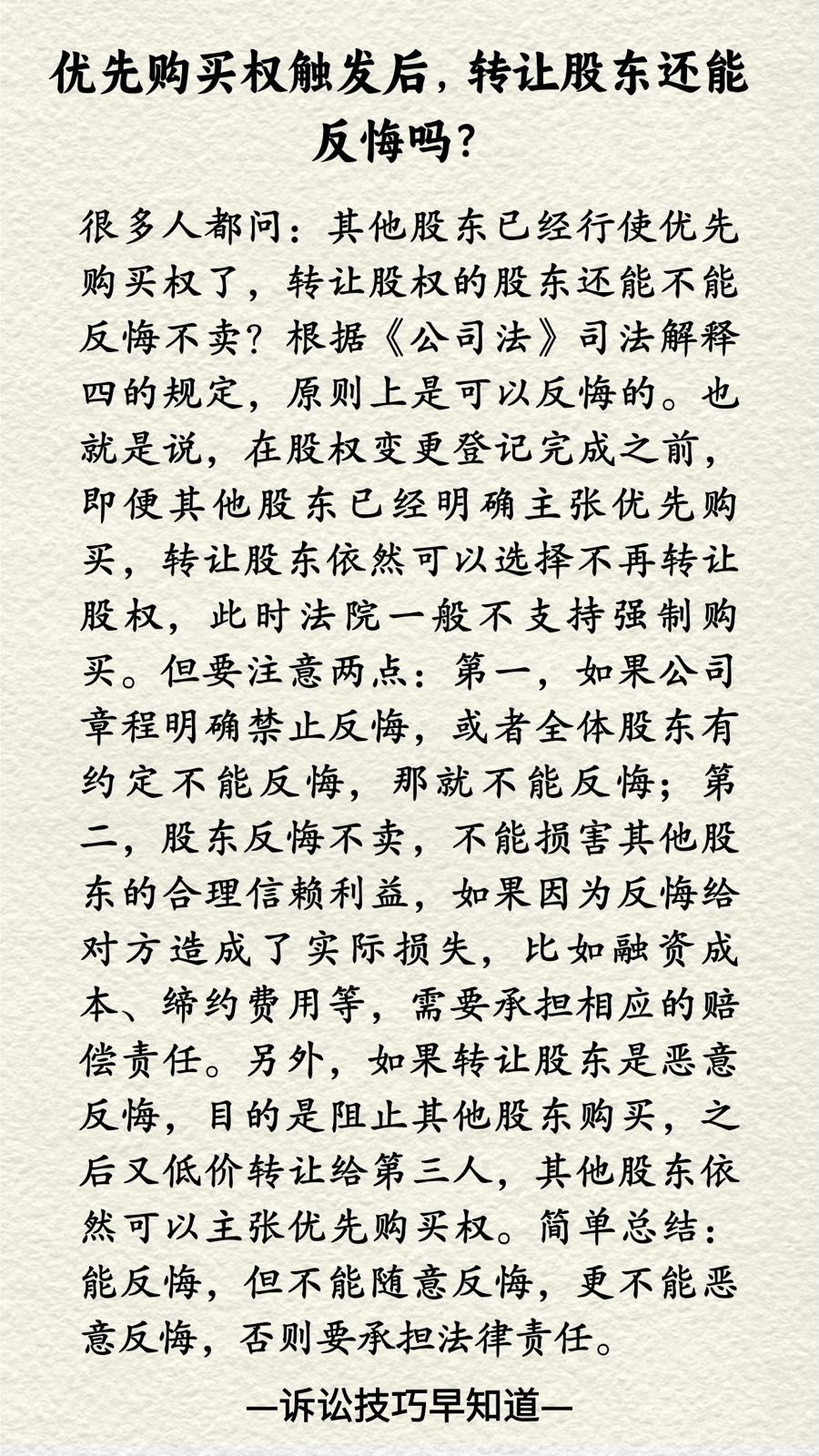 诉讼技巧早知道204|优先购买权触发后,转让股东还能反悔吗?